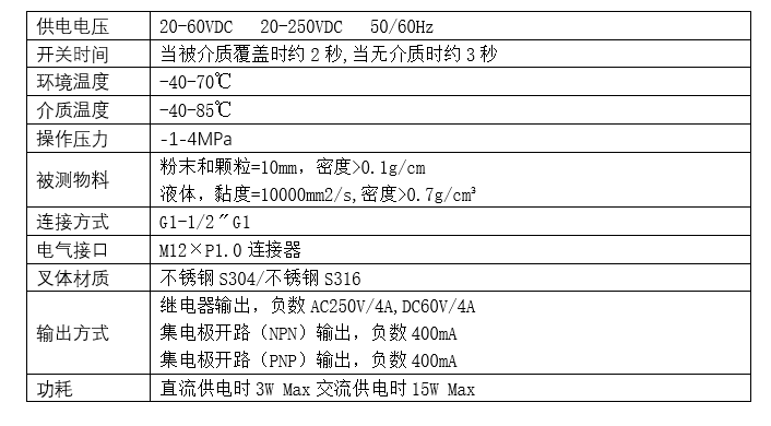 是用于容器、槽罐和各種管道的液位料位測量,控制的。音叉物位開關通過震動原理來測量物位高度音叉由晶體激勵產(chǎn)生振動,當音叉被液體或固體浸沒時振動頻率發(fā)生變化,通過安裝在音叉基座上的一對壓電晶體使音叉在共振頻率下振動。當音叉與被測介質(zhì)相接觸時,音叉的頻率和振幅將改變,這些變化由智能電路來進行檢測,處理并將之轉(zhuǎn)換為一個開關信號。